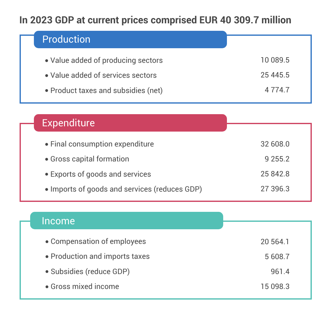 Data compiled by the Central Statistical Bureau (CSB) show that in 2023, as compared to 2022, Gross Domestic Product (GDP) decreased by 0.3 %. In 2023, GDP at current prices amounted to EUR 40.3 billion.