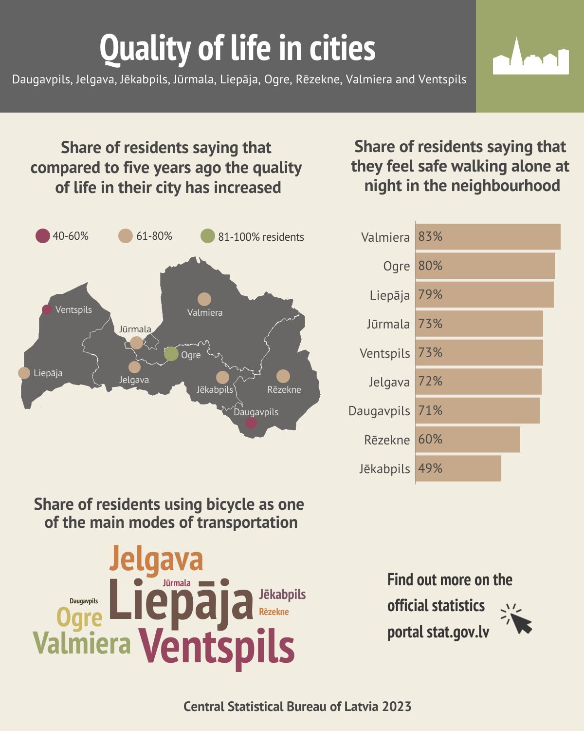 V23021Infographic29.03.2023Quality of life in citiesDownloadShareshare on Facebookshare on Xshare on Draugiem.lvCopy URLDate of publication29.03.2023AgencyCentral Statistical Bureau of LatviaThemesIndicators of well-being and equalityQuality of lifeSee all infographics in search