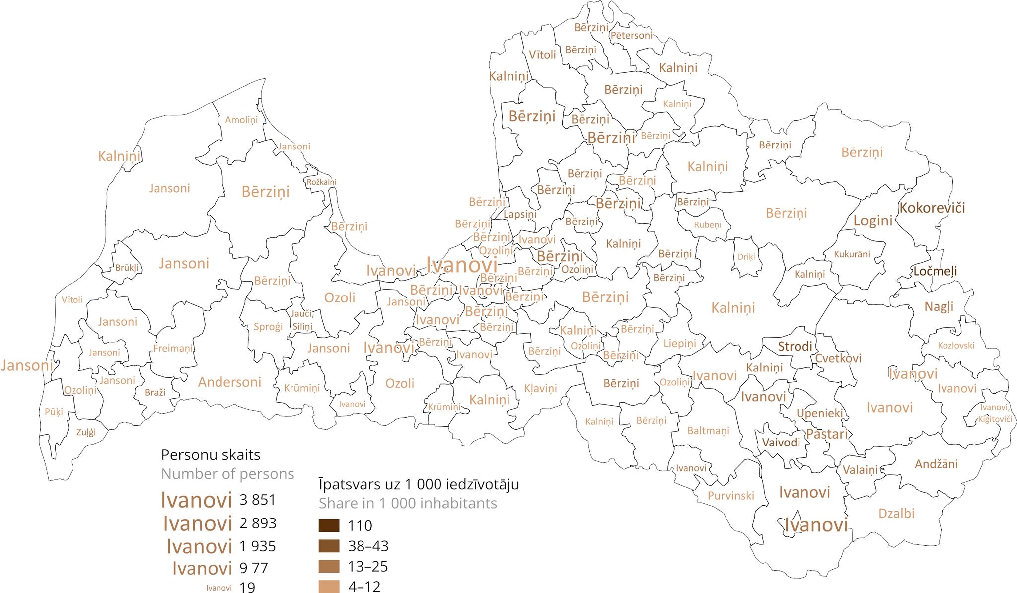 Visizplatītākie uzvārdi starp Latvijas pastāvīgajiem iedzīvotājiem ir Ivanovs/-a (11 tūkst.) un Bērziņš/-a (10 tūkst.). Ap 8 tūkstošiem iedzīvotāju uzvārds ir Kalniņš/-a un Ozoliņš/-a. Virs 5 tūkstošiem personu ir uzvārds Jansons/-e, Ozols/-a, Liepiņš/-a, Krūmiņš/-a un Vasiļjevs/-a.