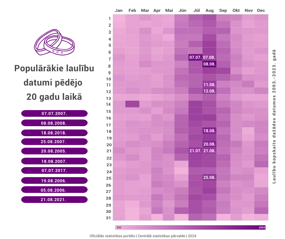 V24024Infografika07.07.2024Populārākie laulību datumi pēdējo 20 gadu laikāLejupielādētIeteiktieteikt vietnē Facebookieteikt vietnē Xieteikt vietnē Draugiem.lvKopēt saitiPublicēšanas datums07.07.2024IestādeCentrālā statistikas pārvaldeTēmasIedzīvotājiLaulībasSkatīt jaunākās infografikas meklētājā